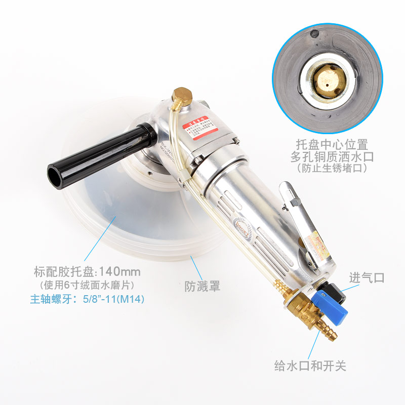 • 產(chǎn)品參數(shù): 托盤(pán)尺寸:140mm(M14螺牙);使用磨片:140mm或150mm;轉(zhuǎn)速:4200rpm;長(zhǎng)度:330mm;重量:2.64kg;功率:0.64hp;耗氣量:0.47立方米/分鐘;使用工作氣壓:0.63Mpa;推薦氣管內(nèi)徑8mm;平時(shí)使用應(yīng)多加氣動(dòng)油保養(yǎng)