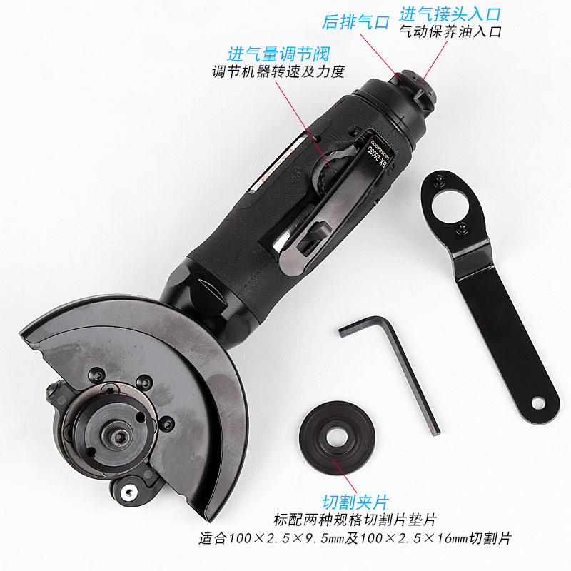 • 產(chǎn)品參數(shù): 砂輪尺寸:100×2.5×10mm,100×2.5×16mm; 砂輪孔徑:10和16mm; 空載轉(zhuǎn)速:13000rpm; 外形尺寸:50×240mm; 工具重量:1.08kg; 馬達(dá)功率:1HP; 耗氣量:0.5立方米/分鐘; 使用工作氣壓:0.65Mpa; 推薦使用內(nèi)徑8mm氣管; 平時(shí)使用應(yīng)多加氣動(dòng)油保養(yǎng)