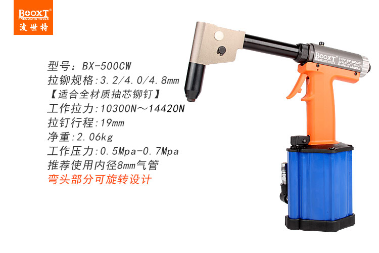 東莞市強(qiáng)勁五金工具有限公司提供臺(tái)灣BOOXT波世特品牌氣動(dòng)工具,彎頭氣動(dòng)拉釘槍BX-500CW廠家直銷,首件享特價(jià)。咨詢熱線:4008301980