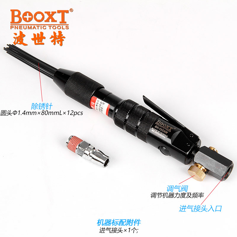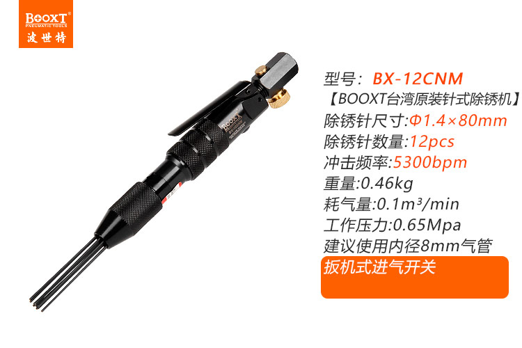 • 產(chǎn)品參數(shù): 沖擊頻率:5300bpm 除銹針數(shù)量:12pcs 除銹針尺寸:M1.4*80L 耗 氣 量:0.1m3/min 全 長(zhǎng):245mm 凈 重:0.46kg 【迷你型】
