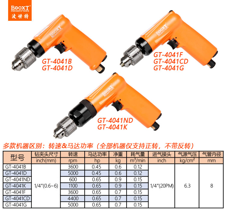 東莞市強勁五金工具有限公司提供臺灣BOOXT波世特品牌氣動工具,1100轉(zhuǎn)氣動鉆GT-4041K廠家直銷,首件享特價。咨詢熱線:4008301980