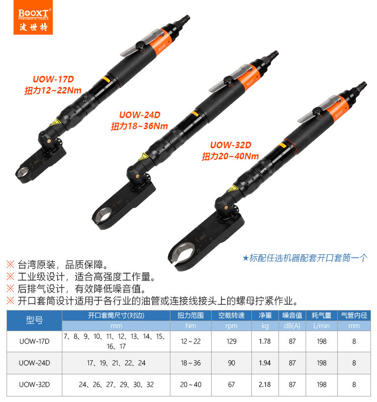 東莞市強(qiáng)勁五金工具有限公司提供臺(tái)灣BOOXT波世特品牌氣動(dòng)工具,大扭矩氣動(dòng)開口扳手UOW-24D廠家直銷,首件享特價(jià)。咨詢熱線:4008301980