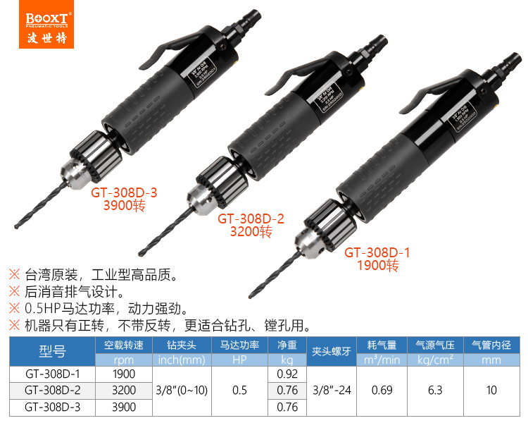東莞市強(qiáng)勁五金工具有限公司提供臺灣BOOXT波世特品牌氣動工具,直式氣鉆GT-308D-1廠家直銷,首件享特價。咨詢熱線:4008301980